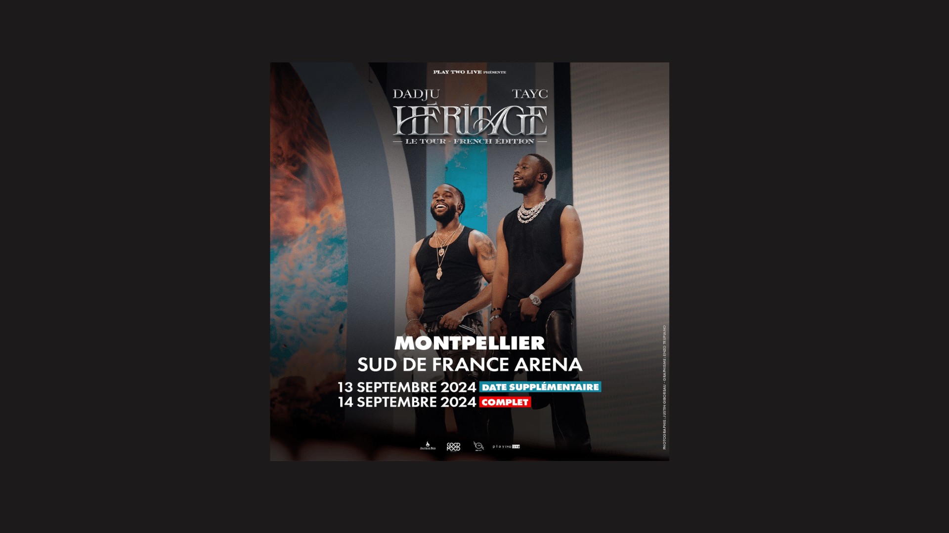 Après une date SOLD OUT à l’Accor Arena le 15 février 2024, et une série de 9 concerts à succès à la Seine Musicale à Paris au printemps, Dadju et Tayc annoncent 4 concerts exclusifs à travers la France et la Belgique dont 2 dates à La Sud de France Arena les 13 et 14 Septembre 2024.